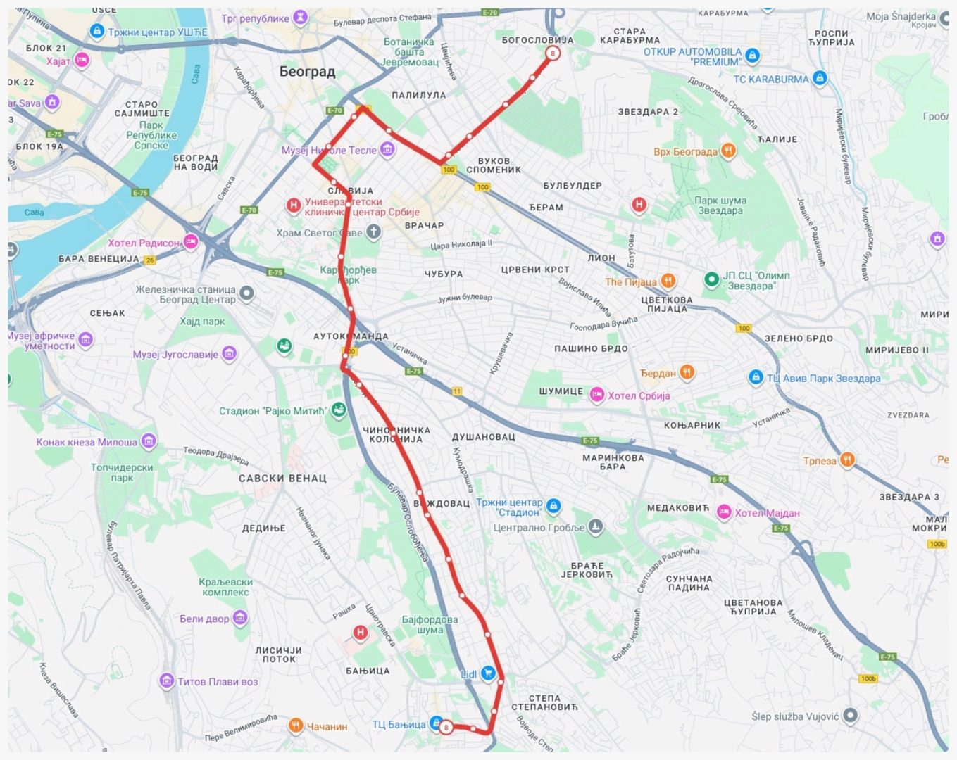 Mapa – Trasa linije broj 8 (Omladinski stadion – Banjica) (od 01.02.2026)