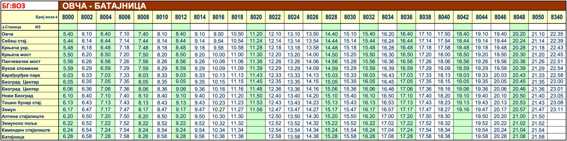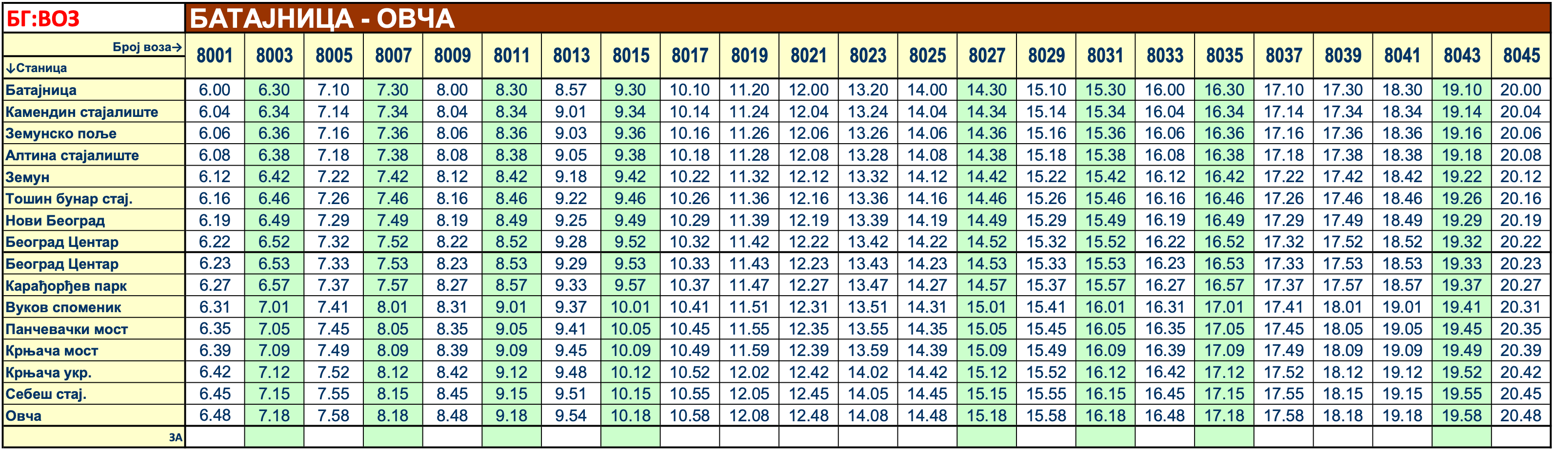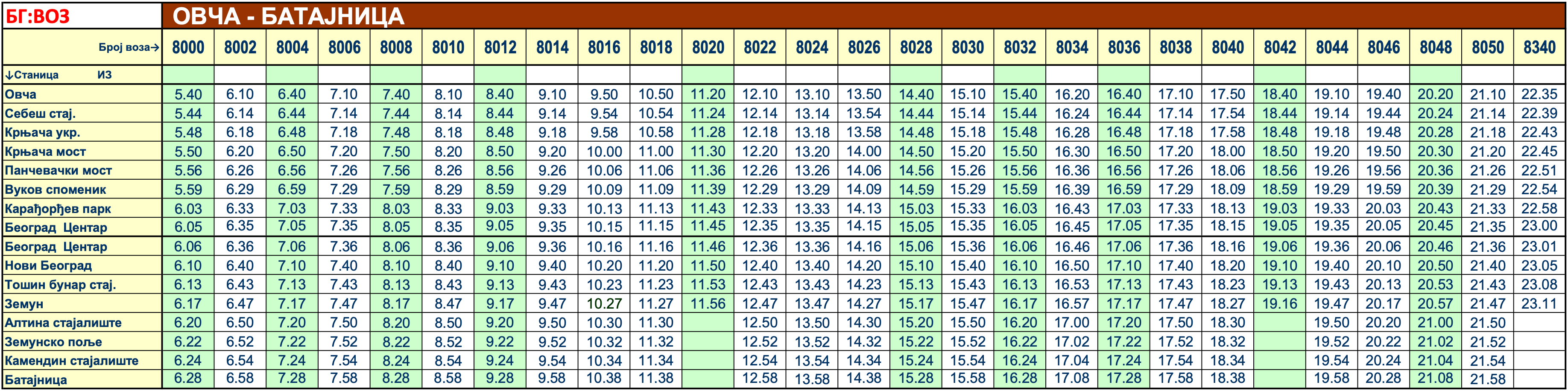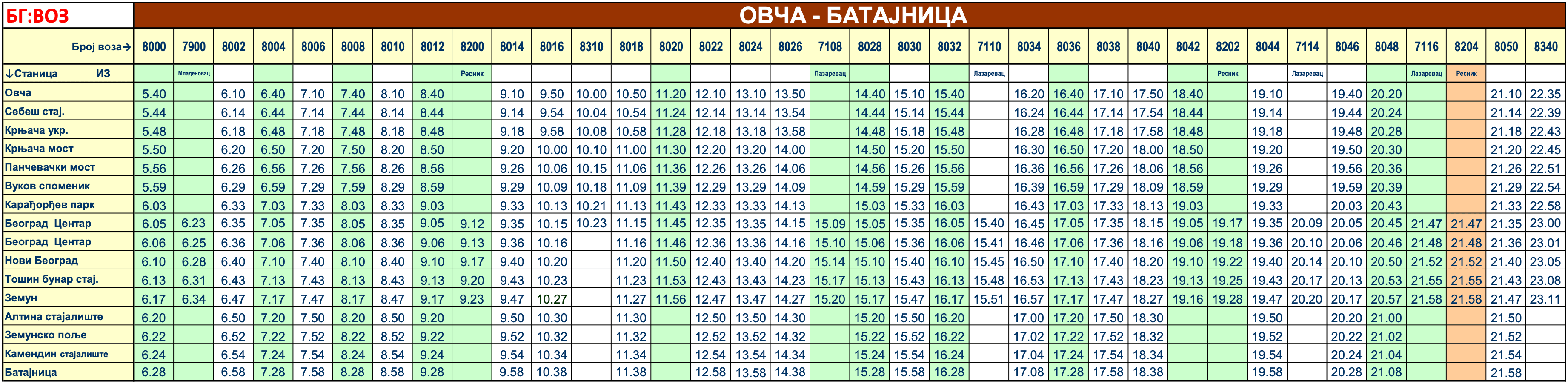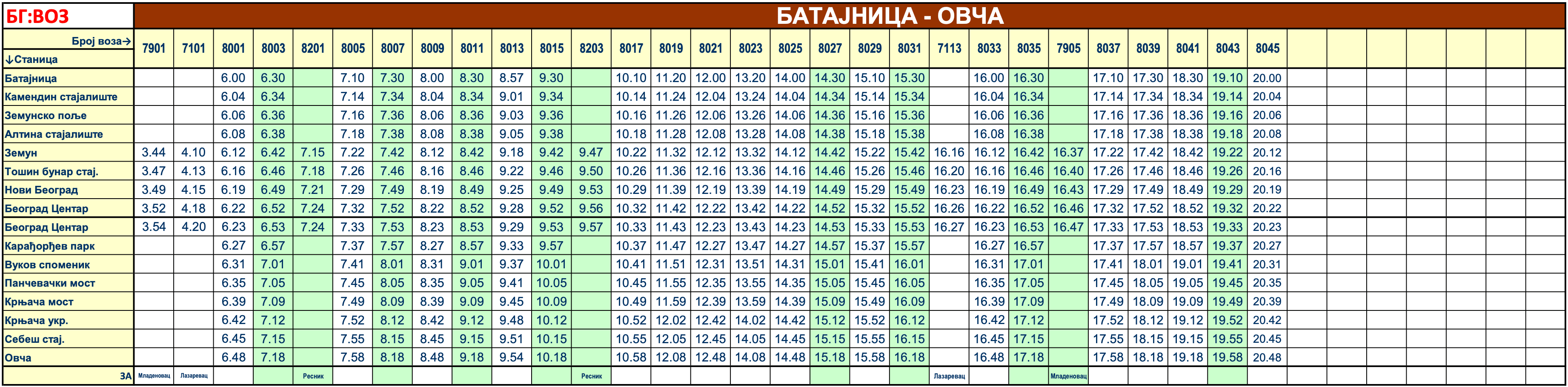 Red vožnje – Linija BG Voz 1 · Batajnica · Ovča